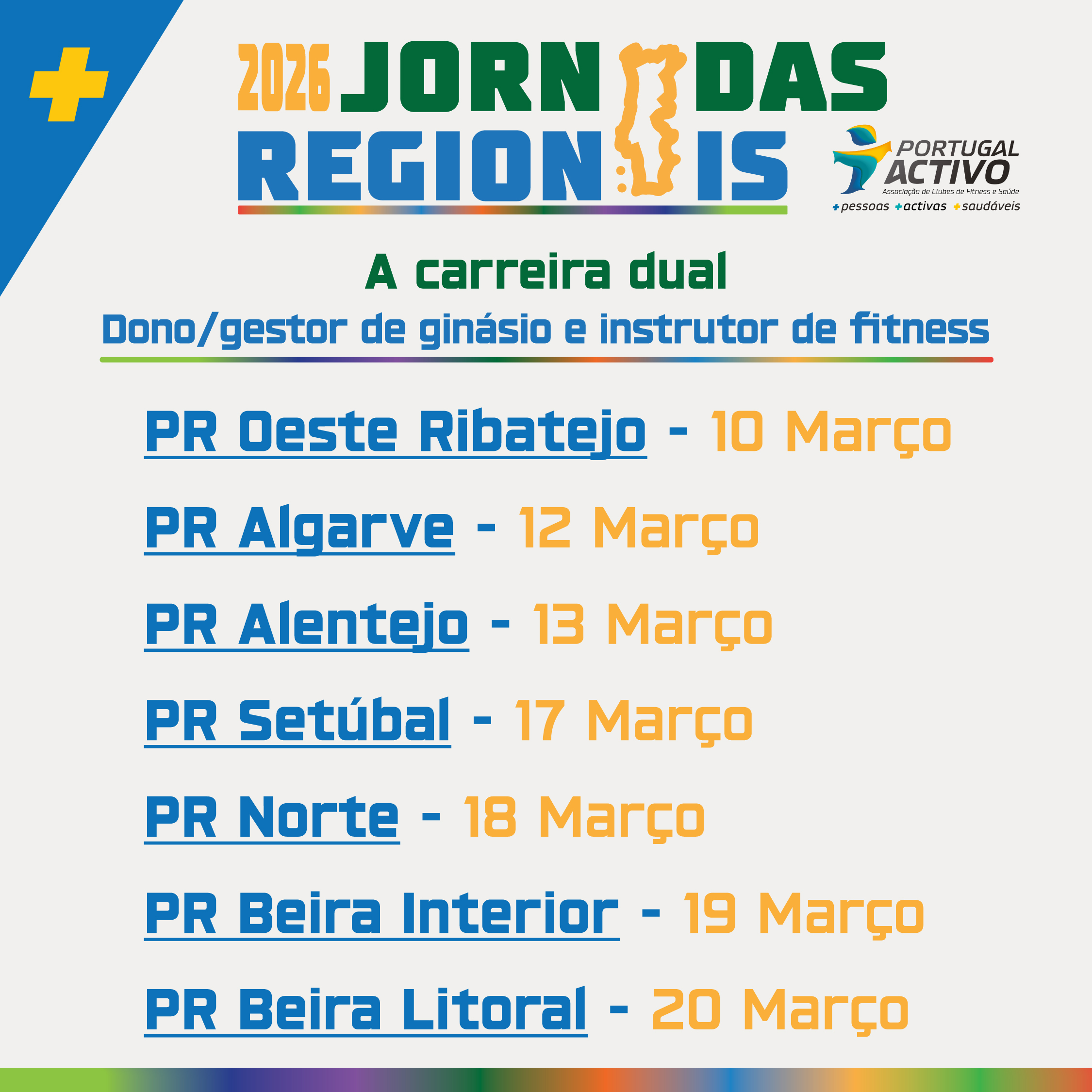 Estão de volta as Jornadas Regionais da Portugal Activo! Em 2026, vamos percorrer Portugal Continental com 7 eventos focados num dos maiores desafios atuais do nosso setor: A Carreira Dual: Dono/Gestor de Ginásio e Instrutor de Fitness.