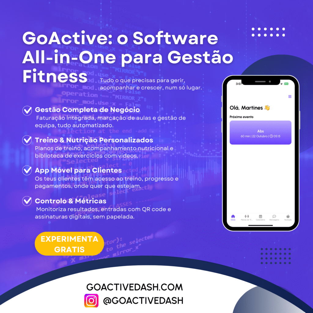 A GoActive é um software de gestão desenvolvido para Personal Trainers e Ginásios que procuram simplificar a forma como trabalham, gerem e fazem crescer o seu negócio. Criada com base na experiência real de profissionais do fitness, a GoActive oferece uma solução all-in-one, que centraliza num só lugar a gestão de clientes, treinos, pagamentos, métricas […]