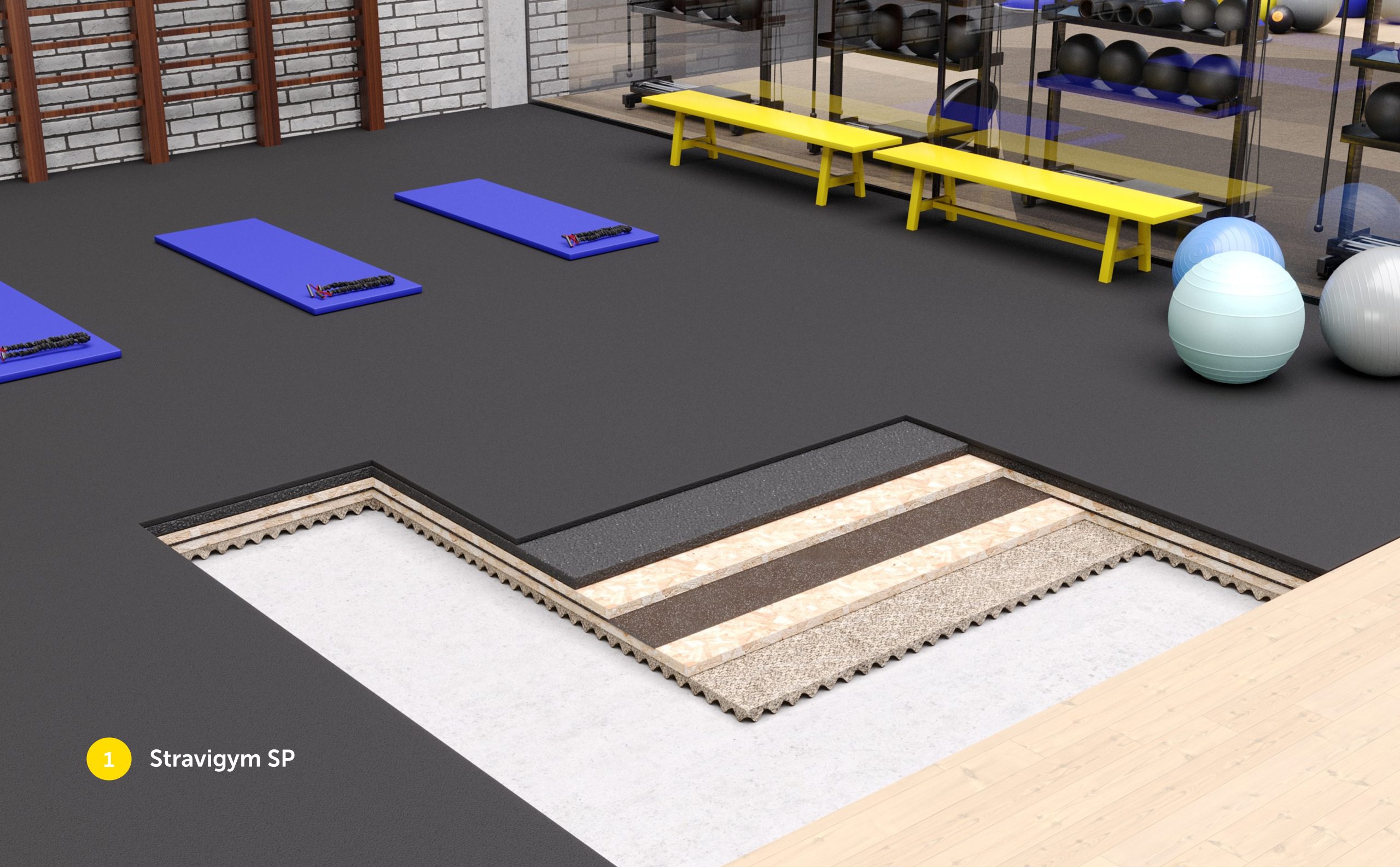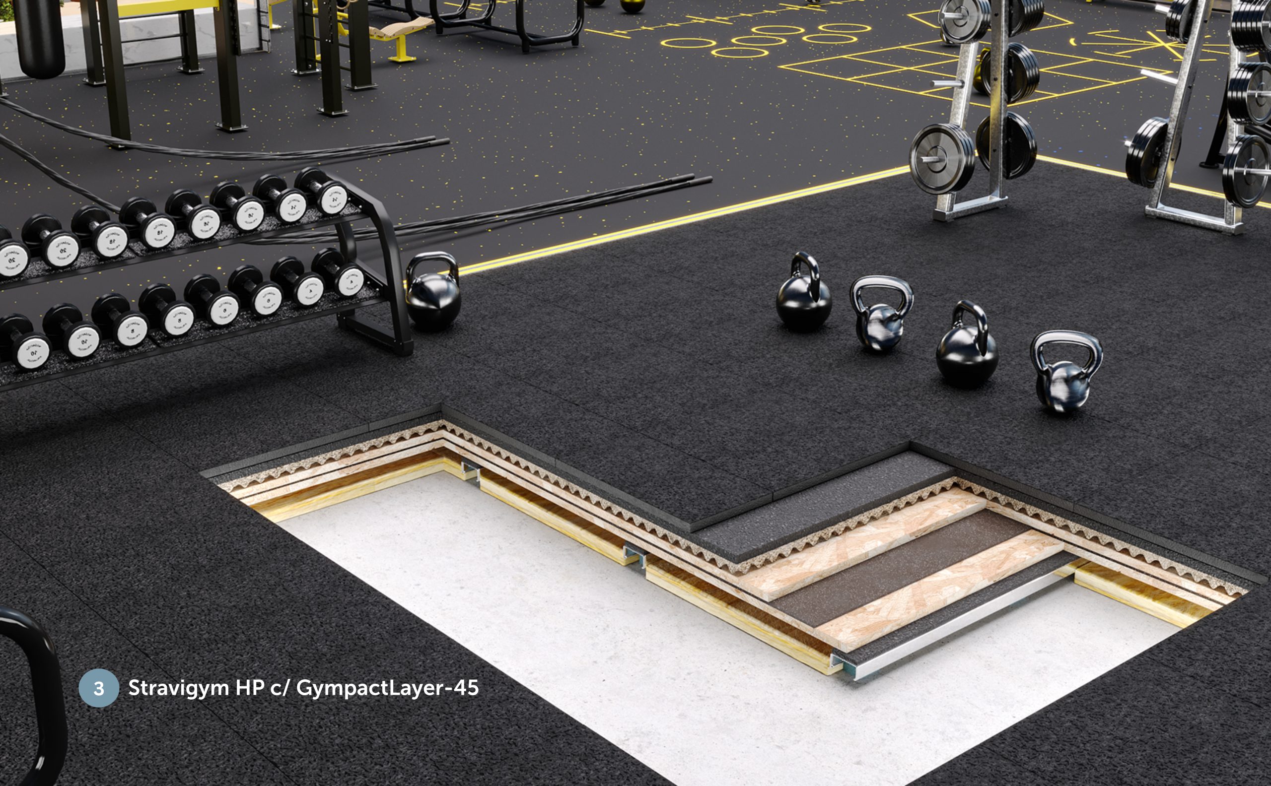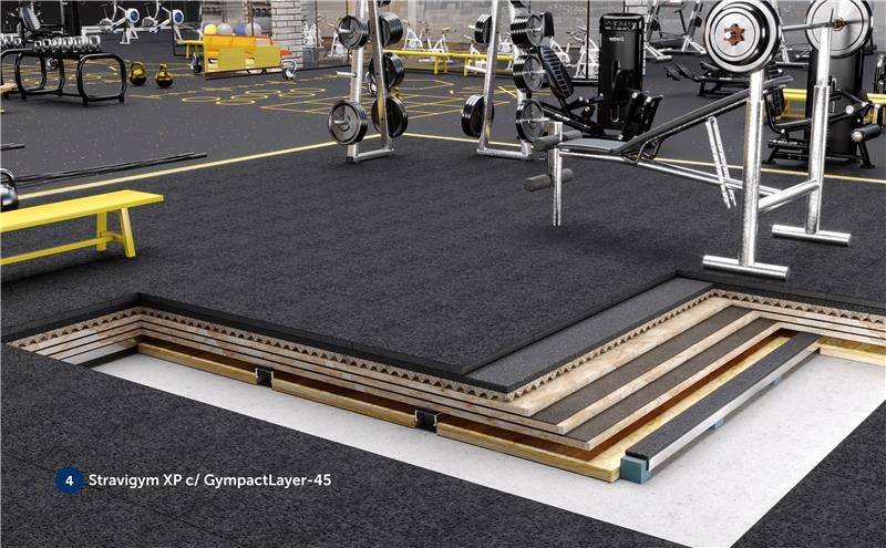 Para responder aos desafios específicos do setor do fitness, desenvolvemos a gama Stravigym – soluções de pavimentos acústicos dedicadas a ginásios, baseadas em construção sem betão ou betonilhas e modular. Cada sistema é desenhado à medida das necessidades reais de cada zona do ginásio, garantindo o desempenho necessário, sem sobredimensionamento nem custos desnecessários. As soluções são ajustadas ao tipo de atividade (pesos livres, aulas de grupo, cardio), aos requisitos acústicos e às limitações do edifício (exemplo: capacidade de carga da estrutura).